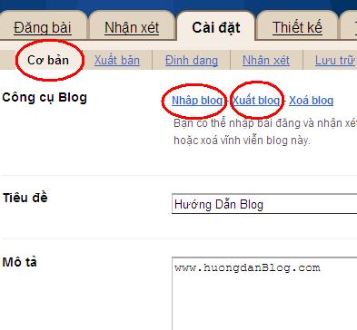 Vào "Cài đặt" >>> "Cơ bản" >>> "Nhập blog">>> "Browse" chọn file tải lên >>> nhập mã xác nhận >>> "Nhập blog"